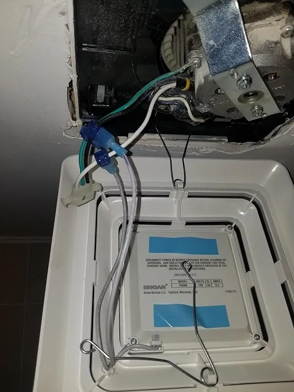 In terms of installation, the fan is quieter than the previous one, which was a 70s NuTone Heater/Vent/Light. However, the exhaust direction differs from the NuTone, requiring some adjustments to connect it to the existing exhaust. The reviewer had to cut out a section of the ceiling that needed replacement anyway to facilitate the installation.