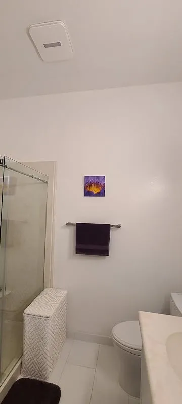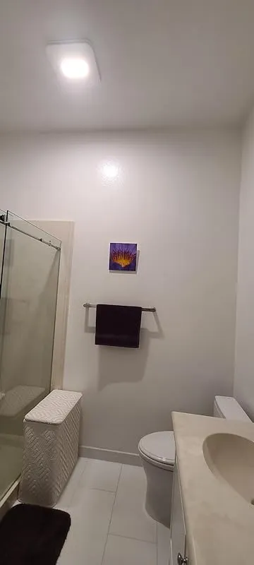 The upgraded fan in this bathroom is a significant improvement over the outdated one from 1986. Despite some minor installation challenges, such as the need for an extra wire and a custom box in the attic, the fan looks amazing. The reviewer chose not to wire the nightlight, but appreciates the option to have a low-level light for creating a pleasant ambiance during bath time. The design of the fan is aesthetically pleasing and easy to assemble.
