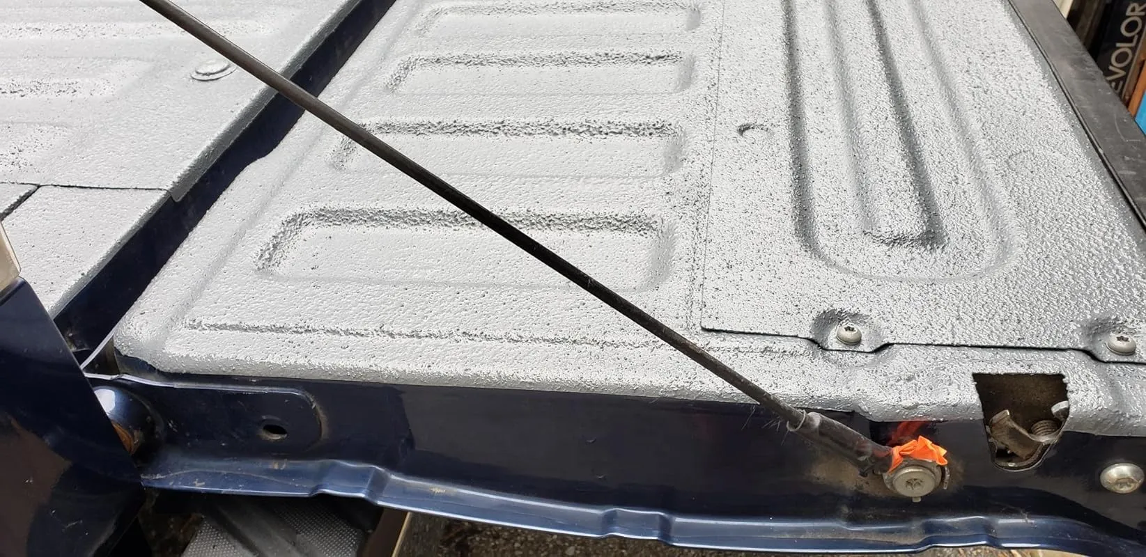 For my El Camino, I used half a gallon of this spray to apply two thick coats. I prepared the surface by scuffing up the old bedliner and removing any chipped areas. The spray went on smoothly and left a fantastic finish. It seems to be durable, and I am impressed with the results.