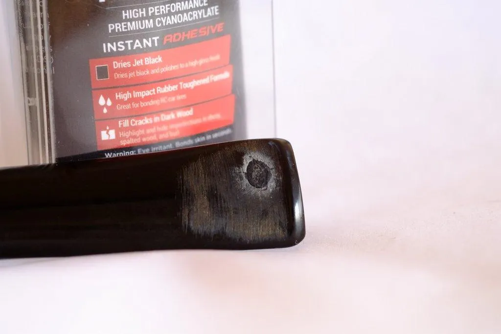 Moving on to another application, I also used this product to restore a Vulcanite, hard rubber tobacco pipe stem with a deep tooth impression. Initially, I made the mistake of not thoroughly cleaning the cavity with acetone, resulting in a white film surrounding the patch. However, a bit of acetone on a paper towel quickly neutralized the residue. After allowing the Starbond to harden and cure, I sanded down the patch and polished it using micro pads. The restoration was a complete success, as I can no longer tell where the patch was made. This first use of Starbond proved to be a 100% success.