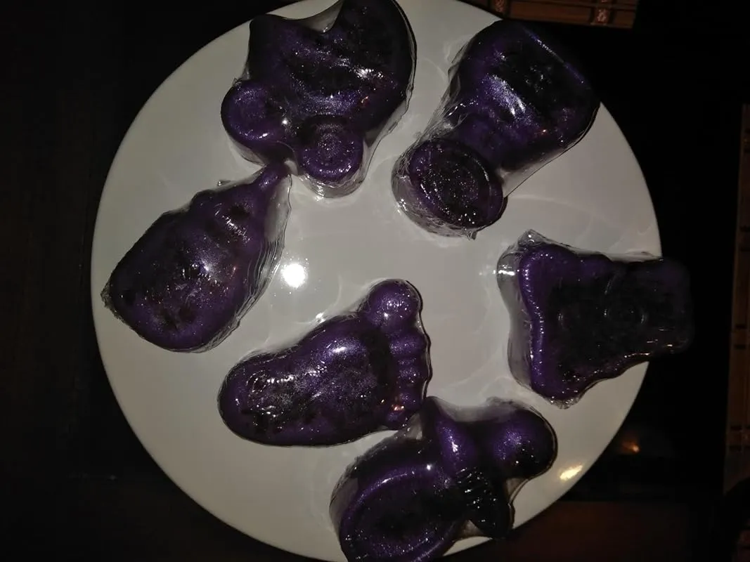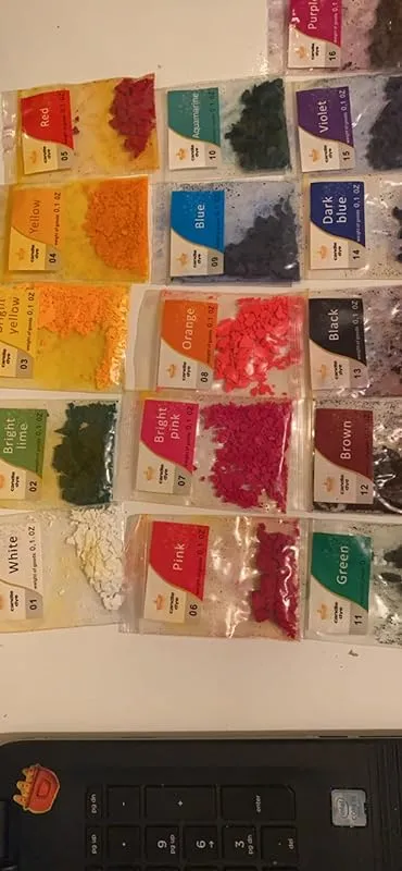 These powders are also fantastic for soap making. They provide bright and vibrant colors without having to use a lot of product. Other soap colors I have used in the past required a significant amount to achieve the desired result, resulting in wastage. However, with these powders, a small amount goes a long way. The variety of colors, such as fuchsia, rose, cherry, wine, chartreuse, coffee, green glitter, violet, blueberry, lavender, forest, kiwi, bronze, gold glitter, pearl, blue sky, and chestnut, are all pretty and can be mixed together as well. I have also used them in my sugar scrubs, bath bombs, and one of my lotions. They add so much fun and creativity to my products, and the price is excellent for the generous size of the packages. Each pack is about the size of a small Kleenex tissue, and you can use them multiple times due to the small amount needed to create a beautiful hue.