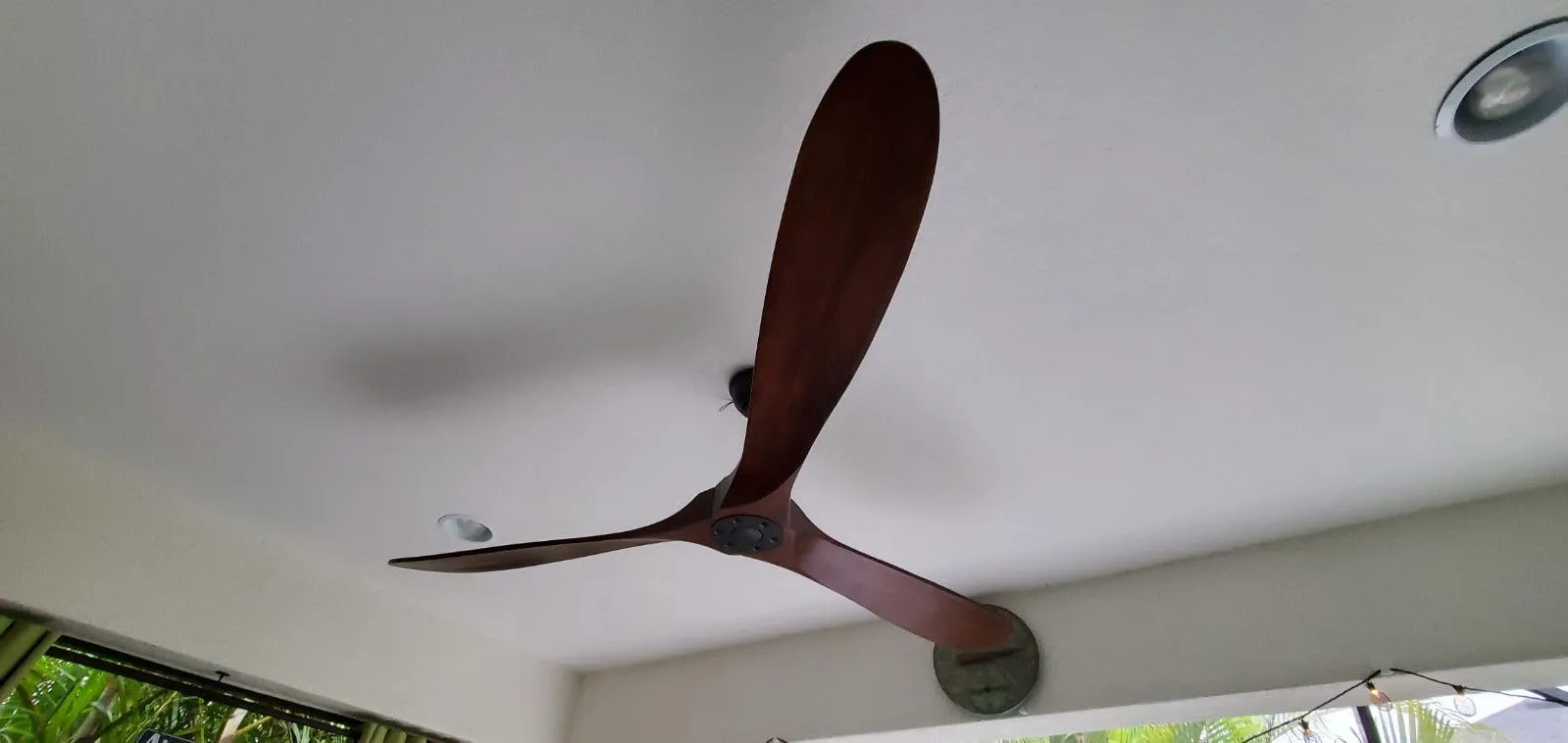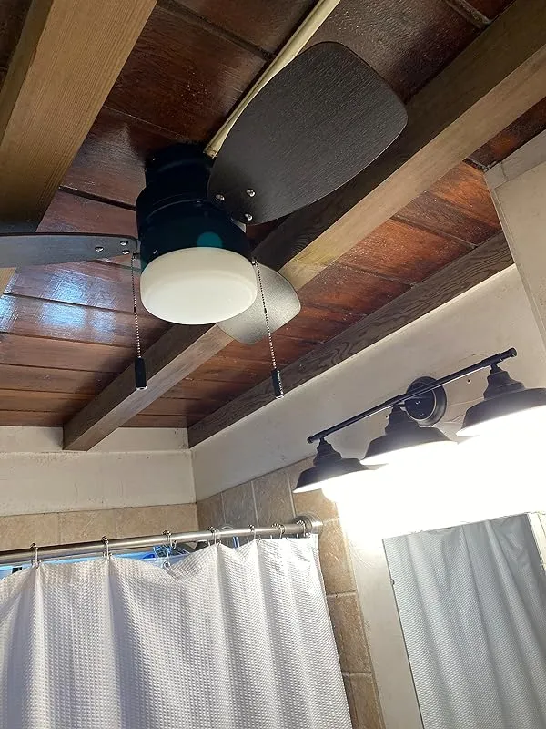 In terms of performance, this fan runs quietly thanks to its shape and shorter blades. It provides good airflow regardless of the speed setting. Moreover, it fits perfectly in the hallway. Just a heads up, the distance between the bottom of the glass cap and the uppermost portion is 12 inches, so it hangs down from the ceiling exactly one foot. The lights that come with the fan have a very yellow color, but I replaced them with "white" lights from a local store.