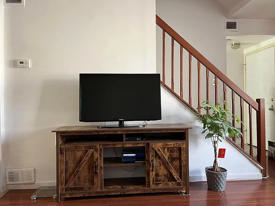 What sets this TV stand apart is its functionality. It offers ample space and separate compartments for organizing your media devices and accessories. Despite its storage capabilities, it doesn't take up much space, making it a perfect fit for any room. Additionally, the design of the stand adds a touch of vintage charm to the room, making it even more visually appealing.