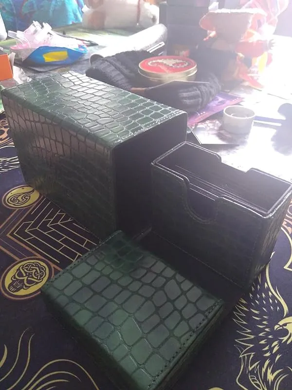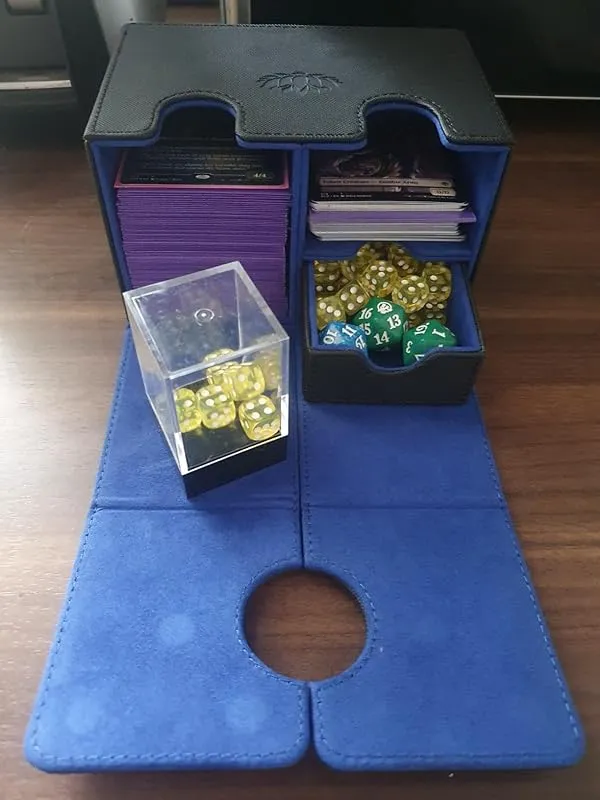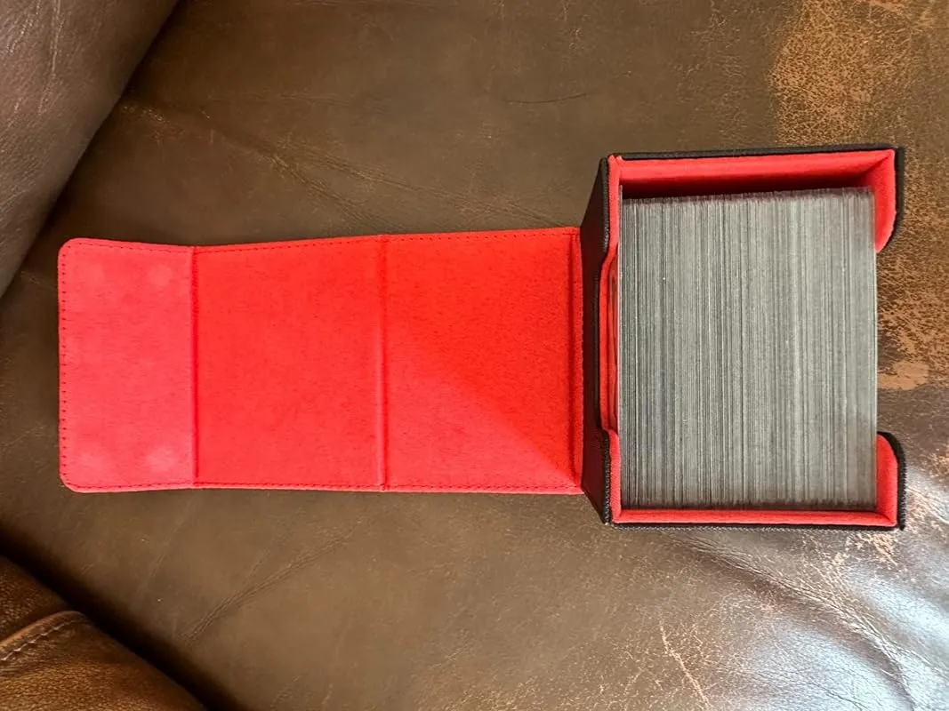 I purchased this deck box as a gift for my partner, and they absolutely love it. They primarily use it for their Magic the Gathering commander deck cards, and it fits them snugly. The box also has room in the middle for a few dice sets, which is a nice added feature. The overall quality of the box is impressive, as it is made of high-quality pleather and feels well put together. It definitely feels like it will last for a long time.