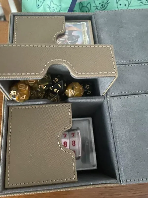 As a first-time deck box user, I find it convenient for storing my dice and counters in the middle compartment. However, it doesn't perfectly fit them in a row, which can be a bit annoying. Nonetheless, the box serves its purpose well by keeping everything safely inside. It may require some effort to take the cards out at times, but it still functions perfectly fine. Overall, it's a good buy and I'm satisfied with my purchase.