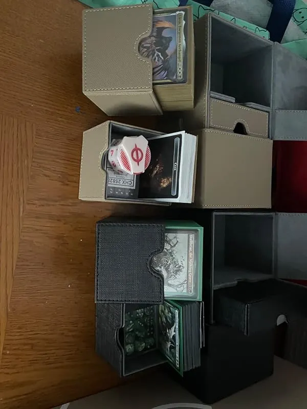 In fact, I am so satisfied with this deck box that I currently own two of them and I am considering getting another one. They are spacious enough to fit two double sleeved MTG Commander decks if needed. I use one box for each of my decks, and the other slot is perfect for storing tokens, a life counter, and mini dice. It's a sturdy and efficient solution.
