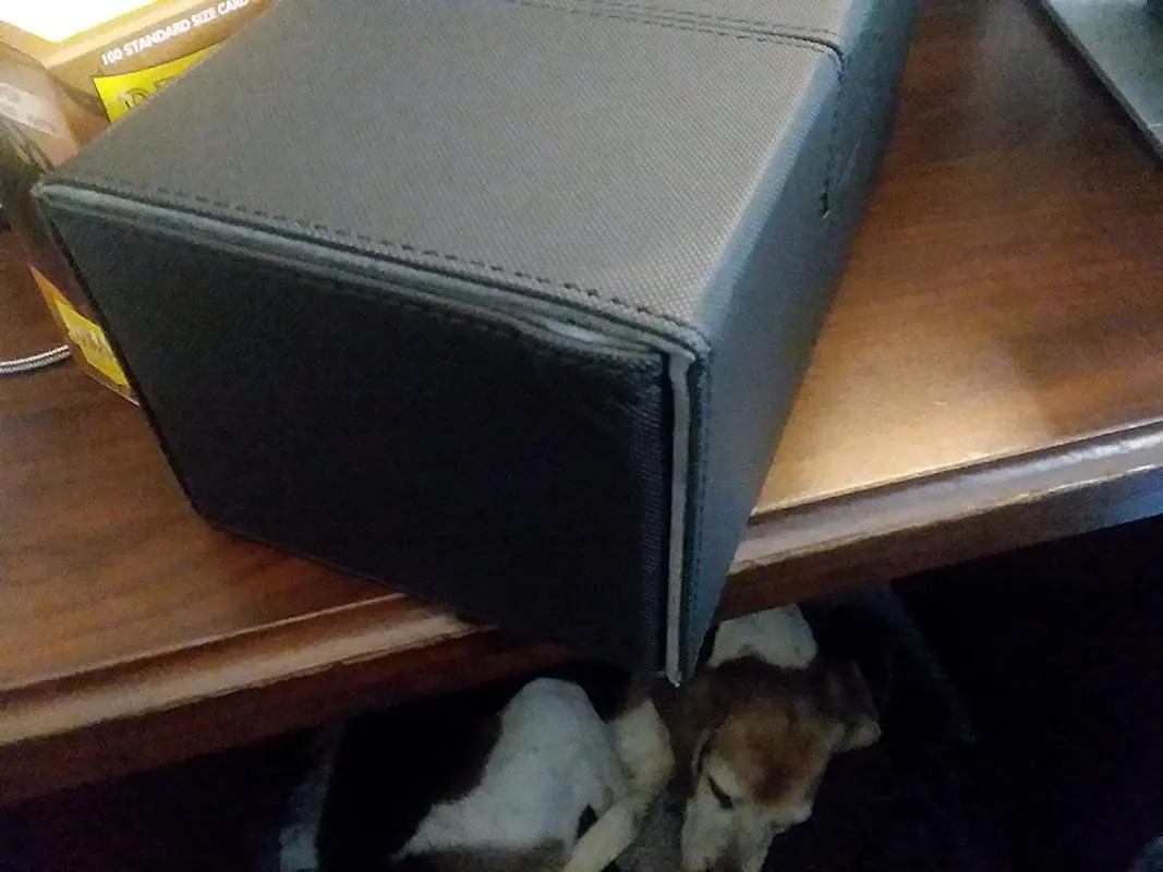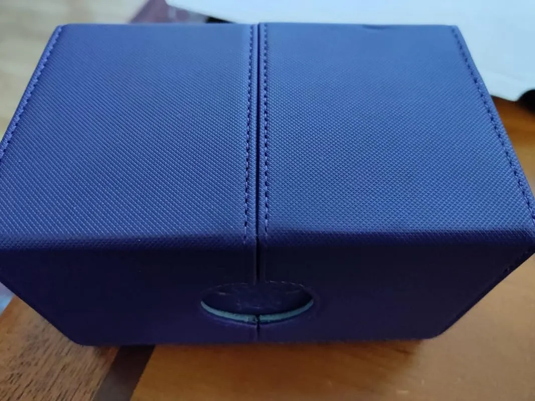 In terms of assembly, the box is well put together with sturdy stitching. In case the glue starts to wear off, it can easily be fixed. The design of the box is also commendable, as there is no shelf inside that could potentially damage the cards. With enough room for a 100 card double-sleeved deck, there is also ample space for additional cards. Compared to other boxes from top brands, this box may not have all the extra features such as an elastic band or fully removable cover, but it makes up for it by providing a storage compartment that doesn't pose a risk of card damage and offers more room. It has become a personal favorite among the various boxes purchased recently.