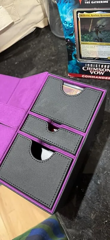 I purchased two units of this storage box to house my four decks, and I'm very happy with its performance. The construction is top-notch, and it feels incredibly well-made. The compartments snugly fit two double-sleeved commander decks, while the middle tray is perfect for storing tokens and dice. It keeps everything organized and secure.