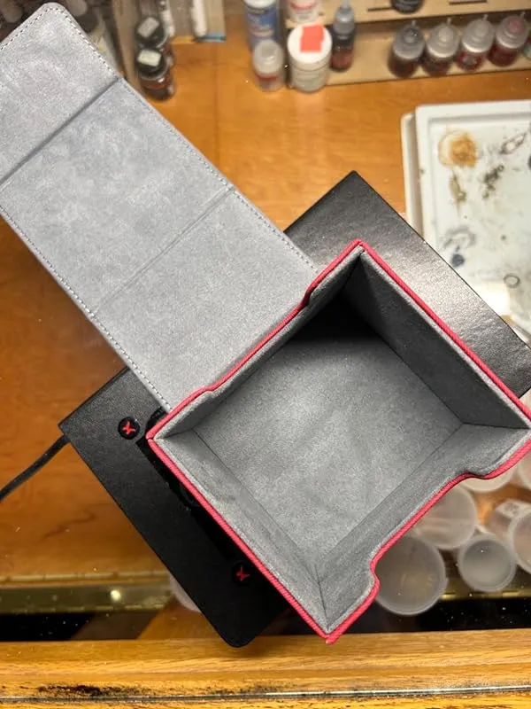 The box is sturdy and can hold 100 double-sleeved MTG-sized cards in each compartment. The tray in the middle is spacious enough to accommodate several bundle oversized dice or other items of similar size. The color of the box I received was pink and black, which differs from the red and black shown in the product picture. Nevertheless, the box still appears to be durable and provides excellent protection for my cards. It is also very portable, which is a plus.