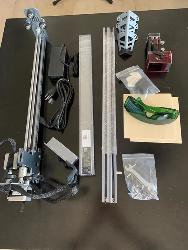 As someone new to laser engraving, I wanted to develop my hobby in my spare time. I did my research by watching numerous YouTube videos on laser engraving and I was eager to create unique creations of my own. To my delight, the laser engraver arrived the very next day, packaged securely in a long box. It came with all the necessary tools for assembly, including a pair of green protective eyewear and a user guide. It took me about ten minutes to put everything together, with the most important step being the connection between the pulley and the conveyor belt (be sure to check out the installation video).