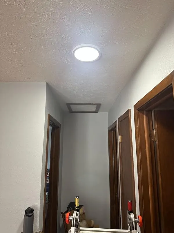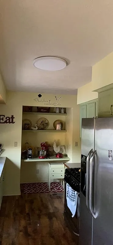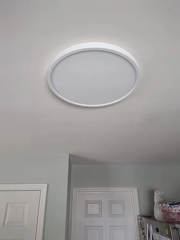 What I love about this light is its versatility. It features a switch inside the rim that allows you to choose from three different brightness settings. We went with the brightest setting and it illuminates our entire kitchen beautifully. Despite its powerful lighting capabilities, the fixture itself is completely flat and only about 1" thick, making it a sleek and unobtrusive addition to our ceiling.