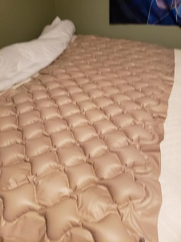 Firstly, it is important to note that this pad is not your typical air mattress. It is designed specifically to prevent pressure sores and provide support. I placed it under our existing cloth mattress pad and found that it was quite long, requiring some adjustments. I folded the top under itself and let the extra hang over the end of the mattress, which affected the fitted sheet but can easily be resolved by folding it under during sheet changes.