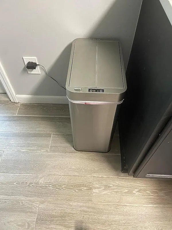 I recently purchased a new garbage pail and I have to say, I am absolutely thrilled with it. The stainless and black colors perfectly complement my new kitchen, giving it a sleek and modern look. We opted to have it plugged in rather than using batteries, and it was a wise choice considering we had a plug conveniently located behind where we keep our garbage.