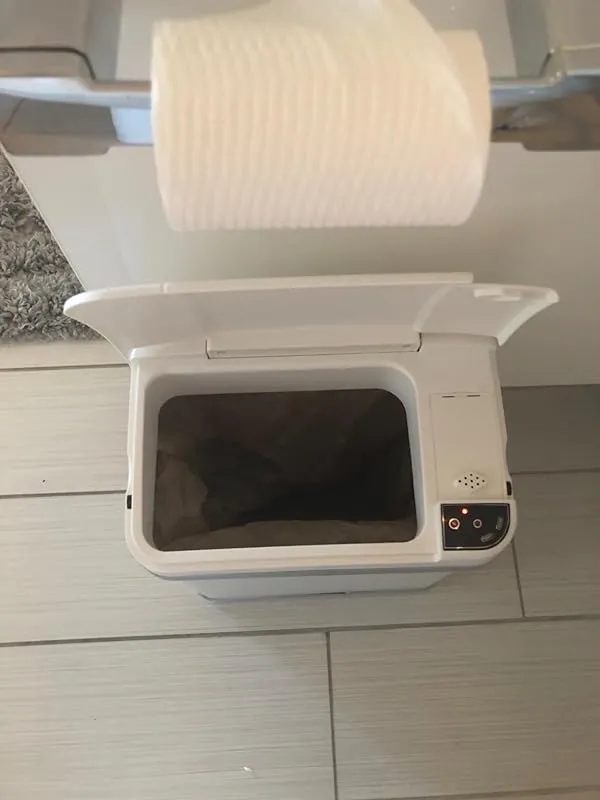 Another feature I love is the sturdy plastic ring that hides the garbage bag on the sides, maintaining a clean and aesthetic appearance. The ring also ensures a tight fit between the can and the top piece, so make sure not to lose it! I personally use mine with batteries, and they last anywhere from 6 to 12 months, depending on the brand.
